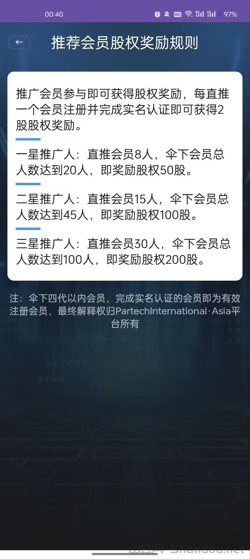 PARCTECH一天签到两次,不看广告,每天一油和2股,满50股权就去释放,上级释放了400多个,一天分红17油,10多油兑换成rmb 满一百就能提。不嫌少的去撸,每天10块钱左右,不推广10天提一次。直推8团队20人每天股权分红20+