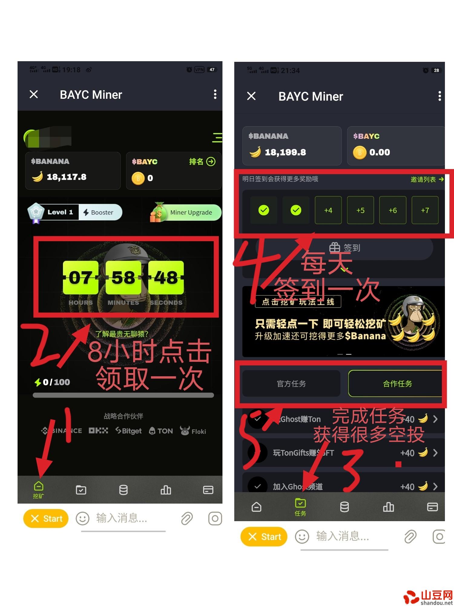 签到链接(开加速器复制浏览器打开跳转到电报领取):https://t.me/baycminer/bayc?startapp=D5VYRG7GRFTMIPKV–